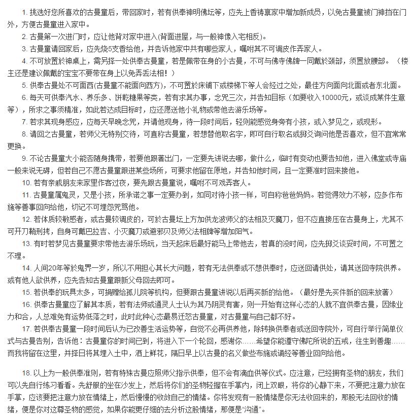 先看看袁立是怎么说的 ![]() 古曼童是真的存在吗? 那么问题来了,古曼童真的存在吗?答案是肯定的!古曼童是真的有这个东西,在泰国也叫“金童子”或者“佛童子”,这些古曼童是用不同的材料做成的,然后会让泰国的高僧把死去婴儿的灵魂注入其中,这样他们就有了灵性,一般在泰国古曼童会用来保护宅院,他生性非常的善良。 ![]() 泰国90%的人都信仰佛教,有很多灵异奇怪的故事,人们对古曼童也是深信不疑,至于会不会有这么好的功效,按照科学的角度来说不太可能有,但是这个世界有太多无法解释的事,谁能说的准呢? 据说很多明星都会请古曼童和小鬼,古曼童跟小鬼不太一样。 古曼童根据主人的要求不同,会分很多类型,有招财型、攻击型、守护型、招人缘型、招异性缘型等等。 明星请的一般都是招人缘、招财的。 古曼童佛牌什么价格怎么养? 古曼童的价格很难说的,大师给注入灵魂的就非常的贵,一般店里的可能就便宜些,据说最便宜的古曼童也得成百上千元。而被一些知名大师注入灵魂(类似开光)的可能要几十万、几百万都有可能。 ![]() 养古曼童可以说非常多的注意事项,比如第一次请回家入门的时候应该先给他烧5根香,并且告诉他家里有多少人,不让让他作弄家人等等,还要每天喂水、养乐多啊等等,毕竟都是小孩跟点孩子们喜欢吃的东西,具体的奉养规矩还有很多,详情可以看下面这个图表,一条条的学习。 ![]() |
