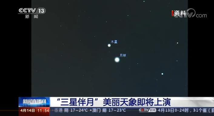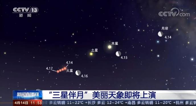 今年从2月开始三星伴月这一奇特的天文景观就一直出现在天空当中,明天(4月15日)黎明,如果天气好,大家就还可以继续欣赏这一精彩的天文现象,但是4月17日开始,月亮将逐渐远离这三颗星球,到了5月份火星也要远离土星和木星,所以明天和后天是难的的观赏三星伴月的好机会,错过又要等很久哟!