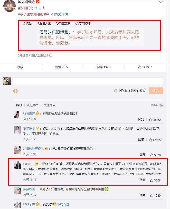 ![]() 另外,还有很多人想知道,一个人濒临死亡,TA最后能感受到这个世界的是什么??最近微博上的一个热搜告诉大家,人在濒临死亡后,最后失去的一个感觉是“听觉”,也就是说,在死亡的最后一刻,是可以听到家属的哭泣声的;还有个网友描述自己父亲去世时候的场景,正好验证了这个医学上的判断:他说在他父亲去世的时候,放鞭炮来告知这里有人去世,当他父亲停止呼吸、鞭炮点燃,他已经去世的父亲被吓的颤抖了一下,以至于他以为父亲又活过来了,可见人最后失去的确实是听觉。所以最后时刻记得告诉我:“你爱我”! ![]() |