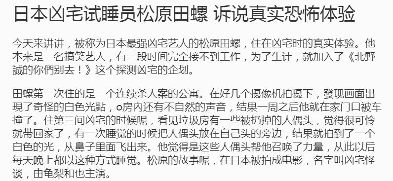 凶宅顾名思义就是出过人命的宅子,而且可能不止一次,因此才会被称为凶宅,就算是胆子再大的人,碰到凶宅也会思虑再三,毕竟自己不害怕,不代表家人不害怕,因此为了家人的健康,很多人都不会选择凶宅,但也有些人,因为各种各样的原因,最终选择了凶宅,那么什么样的人才能镇住凶宅? 首先就是阳气重的人,一般从事军人或者警察类的职业,阳气都比较重,能够镇住妖邪,所以不怕凶宅,其次就是从事风水的大师,这类人就是专门干这个的,自然对凶宅是有办法的,还有就是高僧或者道士,如果能力比较厉害的话,也是能镇住凶宅的,最后就是做屠宰工作的人,也就是古代的屠夫,这类人的杀气比较重,因此能够镇的住凶宅。 据说在日本,新兴了一种职业,叫做凶宅试睡员,就是招聘员工去凶宅里住满一月,如果平安无事的话房子就能出售了,凶宅试睡员就能得到不菲的薪酬,这个工作看似简单,但挑战性还是很大的,有个日本人松原田螺就讲了自己凶宅试睡的真实经历,让人感到毛骨悚然,最后还改编成了电影,感兴趣的人可以去看一下。 凶宅试睡员讲述真实经历 ![]() |