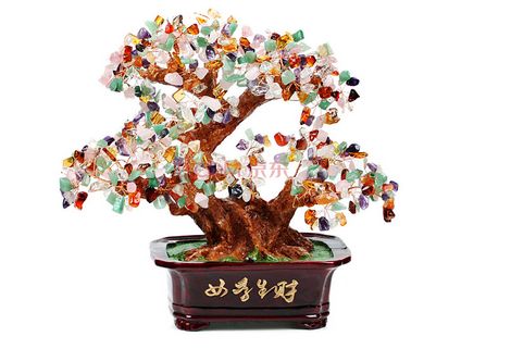 2、人造水晶发财树,有黄水晶发财树,紫水晶发财树等,人造行小盆栽,树枝由金属线条构成,发财树叶可由黄水晶颗粒和紫水晶颗粒等水晶构成。黄水晶发财树,是由数百个黄晶块组成,聚合强大的财福之光,助运改风水最佳选择,招财树。