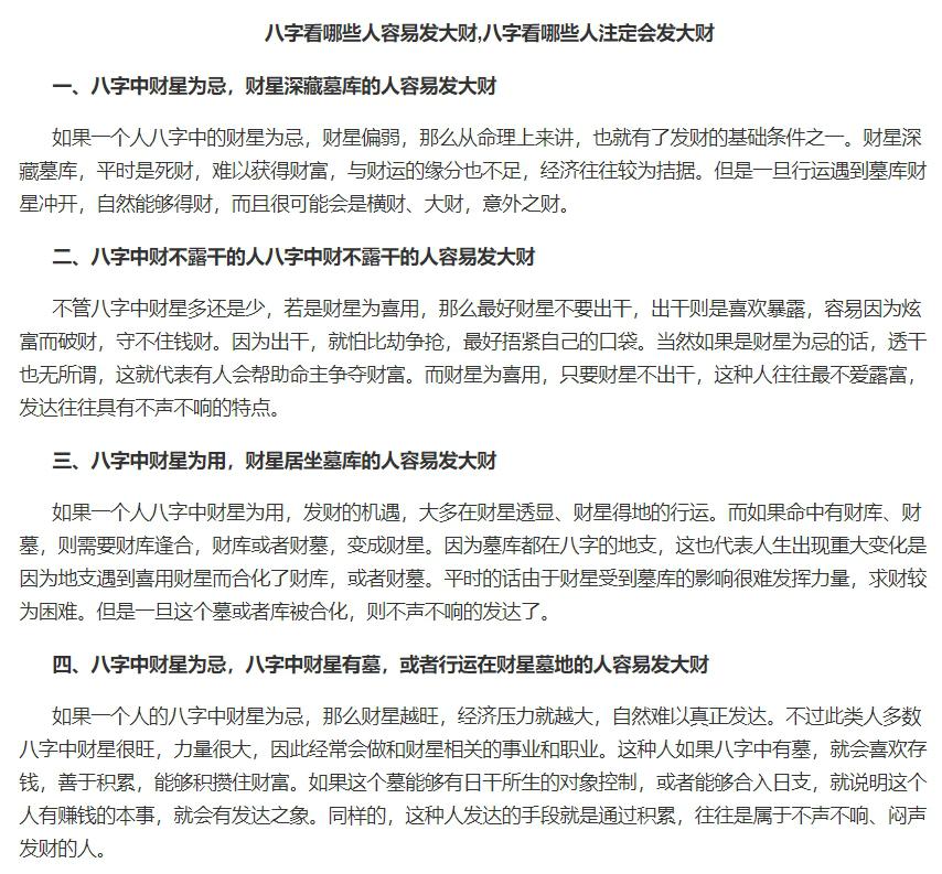 什么八字的人会身价过亿 八字算命是一项比较复杂而且难以掌握的预测技巧,很多算命者都是希望通过自己的八字来测算自己的命运,而测算者中又有很多人是会测算财运的,财运有好有坏,那什么样八字的人财运好呢?下面就让我们来具体了解一下。 这样看来,有这样八字的人是比较容易发大财的。但人的命运三分靠天意,七分靠打拼,只有自己踏实肯干,好的运气才会降临,善于抓住机会,把握机会,才有可能获得真正的财运。 资产过亿的人生活是怎样的 在多数人的眼里,有钱人的生活应该是奢侈的、花天酒地的,在普通人的眼里,甚至还有很多是无法想象的。但是资产过亿的有钱人也分三六九等,在满足自己生活需要的前提下,很多人选择了做慈善、做公益,让自己的财富变得更有意义,这样的有钱人小编是非常佩服的。 |