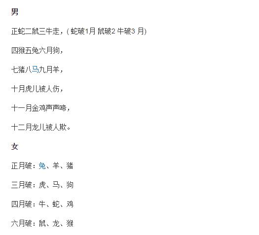 犯月到多少岁没事了? 据了解,犯月是否能够没事跟到了多少岁并没有关系,关于破解犯月是有几种方法的。 其中最常见的是一种是去寺庙或者一些庵堂请破月符。 另外一种就是根据破月歌对应的月份来破解犯月。 下面是破月歌的内容: 另外据说在这些月份当中,每逢十五或者三十是不算破月的,因为十五的满月,三十是无月,并无破月之兆。 犯月的人命就没好的吗 关于犯月的人的命是好还是坏是没有一切很确切的说法的。 有的朋友说命理这一门学问是信则灵,不信则无,另外破月这些讲究现在也就是在一些地区局部存在,许多地方的人还是不信破月、犯月这一类的说法的。 以前是说破月男不能找,找了会活该自己老丈人,如果是破月女就更加娶不得,会害了自己家和娘家。 但是实际上也有很多生肖属相的人是犯月、破月禁忌的,但人家依然生活的好好的,他们都认为这种迷信毫无科学依据可言。 所以对于犯月这一说法,大家各持己见,小编认为就算是不相信但是也要保持好的心态,不去诋毁、轻视这一门学问就好。 |