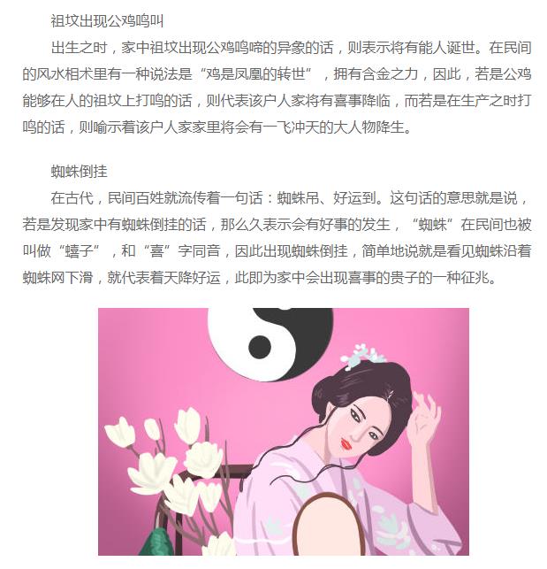 家里出大人物的征兆介绍 据了解,家里会出现大人物的征兆有很多种,其中我们在现代比较常见的就有两种,一个是做怪梦,另一个就是祖坟茂盛。 据说一般有福气的小孩子在出生之前,小孩的家人们会碰到一些比较奇怪的事,比如会做一些奇怪的梦,或者看见奇怪的光、听见奇怪的声音什么的,这些都很可能都是“祥瑞”之兆。 这也就是所谓大人物在出生之前都会有一些看起来让人“可喜可贺的征兆”,也被说成是“生有异禀”的说法。 另一种祖坟茂盛,是稍微有些迷信的说法,但是真实性却更高,就是祖坟茂盛。 据说在农村里许多去世的人的坟地都不难看见有一些树木,但是生长旺盛的树还是很少的,一旦看见有枝叶繁茂的树长在坟边,则预示他的后人能够得到祖先的庇佑,许多风水大师都说这种风水气场能够为后人带来财源,还能让后辈人丁兴旺,可以说是富贵有余的象征了。 但是旺盛的树切忌不能是属阴的树木,例如槐树,桃树还有柳树等。 大人物是上辈子修的福吗? 关于大人物的成长与崛起,许多人都说是上辈子修来的福,冥冥之中都有了安排。 曾经就有一段话是这样描述一些大人物的: 今生的富有荣华,是前世不偷盗的善报。 今生的健康长寿,是前世不杀生的善报。 今生的相貌美丽,是前世不邪淫的善报。 今生的高官厚禄,一言九鼎,是前世不妄语的善报。 许多人都说这辈子的一切所得所有都是上辈子的因缘,例如上辈子是个乐善好施的人这辈子就容易得财,上辈子心地善良常常慈悲放生的人这辈子就能财施、法施、无畏施。 不得不说运气与因缘因果是种很奇妙的东西,没有什么依据也没有什么说法,但是不管怎样,我们在生活中还是应该扎扎实实、脚踏实地的做人,努力的汗水和运气缺一不可。 |