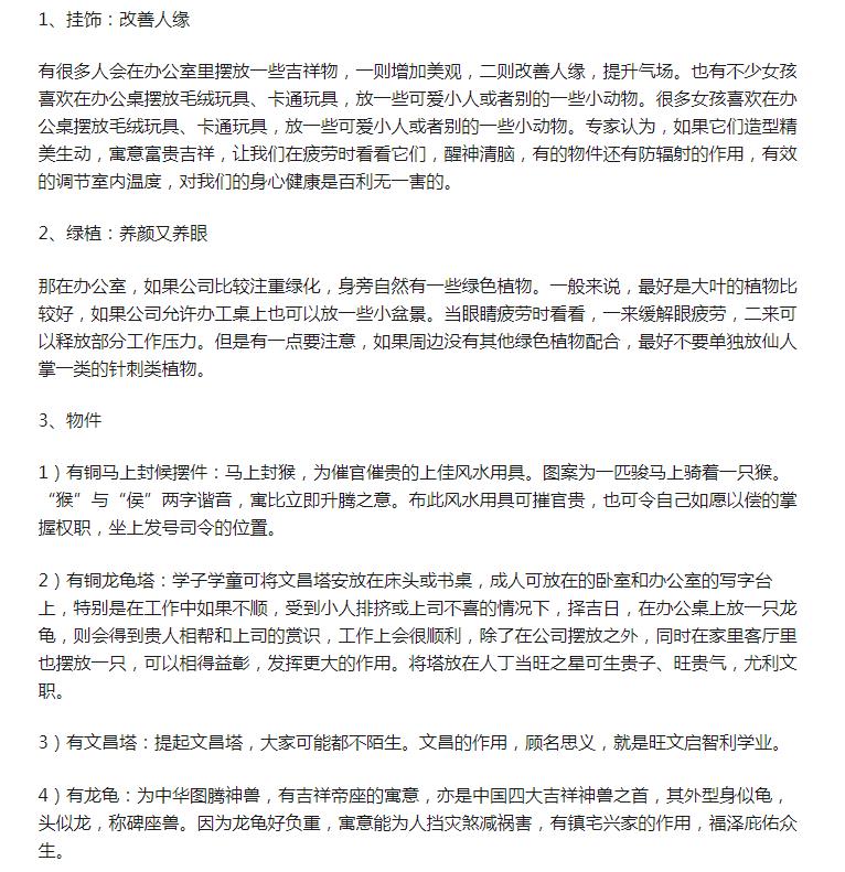 办公桌上放什么吉祥物好, 基本上办公桌摆放什么吉祥物都好,只要不是贵重的,隐私的,会引起他人不适的都可以,什么仙人掌绿植啊,小摆件啊,还有小玩偶,雕像,手办啊。根据自己办公室的情况摆放一些适合自己的东西都可以。 像是总经理等职位的人员,办公桌就不适合摆放太花里胡哨的吉祥物了,基本上办公桌就比较公事的地方了,摆件的选择也要是利于公司利于事业的吉祥物,像是招财的绿植,龙的雕像,金鱼之类的摆件,手工艺品,各种高大上的艺术摆件等等。 小职员就比较不讲究了,摆上相框,摆上自己的喜欢的一切东西,只要占据位置较小,不影响工作,不影响心情,任何吉祥物都可以摆上一两个。 ![]() 办公桌上放镜子、鱼缸好吗? 办公桌放镜子是不太好的,这样会影响工作,时不时的就不自觉的照一下镜子了,再者镜子有点邪气,摆放时间长了会影响身体健康,导致主人脾气变差,破坏风水,甚至招来烂桃花,这些都是不好的现象,镜子是不适宜摆放在办公桌上的。 鱼缸摆在办公桌上是比较好的,但是要注意,不要摆太大的,那样会占据办公桌位置,影响工作资料的摆放,还有鱼的数量,要一只或者四只六只这样的,是比较旺财的。鱼缸选择中规中矩的款式,不要太夸张,鱼缸摆的好了,旺财又利于身心健康的。 |