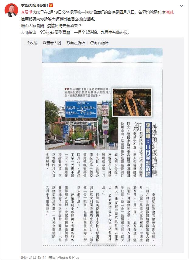 李居明曾在2020年2月19日预测疫情会在2020年阳历11月全部消失,9月份的时候会有药来救。