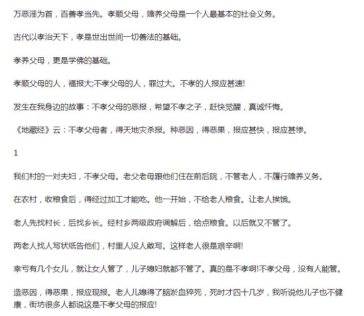 不孝的下场有多可怕, 不孝的人下场不好的逻辑是这样的:不孝的人,人品思想有问题,对父母都不好,对外人自然更不会真心真意,对任何人不真心真意的人,怎么可能在社会上发展起来呢??下场自然是悲催的。 不孝的下场是很可怕的,在古代更有很多民间故事典故以及传说预言来佐证不孝的人下场是极其凄惨的,首先就是会遭雷劈,传说雷公在天上上班,看到不孝的人,就会降下雷罚,这个很多故事戏曲都有杜撰,甚至是忤逆父母都会被雷电恐吓。 然后还会遭到法律的惩戒,在古时候,不孝是编入律法的,据《唐律·名例》载明,有数十种不孝的行为,是要受到律法的惩处的,具体到像是供养有缺,父母丧事时嫁娶娱乐的,不哀悼的。怒骂祖父母,父母的等等,随便犯一个,重则收监关押,轻则杖责一百。 到了现在虽然是没有这么严苛的自然现象,传说故事以及法律法规讲述不孝的下场,但是不孝也是会有很多现实下场,不孝的名声传来工作单位,家庭住址,很可能会被以品行不良而辞退。且受到邻居同事的非议指责,自己的家人孩子也跟着一起受到批评。不孝还可能让自己的孩子受到影响,将来也做出不孝的行为。 不孝的人会有什么报应? 不孝的人会有因果循环的报应,在自身身上,不孝的人可能遭到雷劈,厄运,破财等等不好的事情。死后会下地狱受苦,受到无尽的折磨。而他的来世也不会平顺康宁,他的子孙后代更是不孝者,奸恶之人居多。可以说不孝的报应不仅仅是自身受罚,后代受罚,死后来生也将受罚。 |