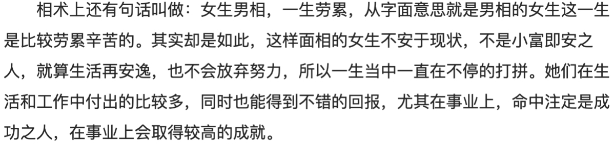 女生男相的代表人物之杨紫琼 女生男相比较特别的一点就是,虽然是女子,但长相却是有些中性的,比如说会有一些男性特征,或者说面部比较硬朗等,在娱乐圈,男生女相的男艺人不少,但是女生男相的明星并不是很多,那么比较有代表性的男生女相是哪些明星? 女生男相的代表人物之林青霞 说起最具代表性的女生男相的艺人,李宇春绝对榜上有名,她从出道开始,就因为中性风而引起热议,就算是出道这么多年了,外界依然有质疑的声音出现,和李宇春走同一路线的,就是刘雨昕,这位选秀出身的爱豆,是最近比较火的流量艺人,其实林青霞也是女生男相,不过因为她长得太美了,以至于被人忽略了她面部比较硬朗的长相。 女生男相的代表人物之李宇春 据说女生男相的人大都是事业容易成功的,而且容易有贵人相助,但是女生男相的人感情上会比较坎坷,有句俗语叫做“女生男相辛苦命”,大意就是这样的人都会像男人一样,敢于拼搏和奋斗,相对于安逸的生活,更喜欢冒险和刺激,这种性格很适合做事业,但是在感情中这样的性格是很容易受伤的,所以女生男相的人感情大多都是不顺的。 ![]() |