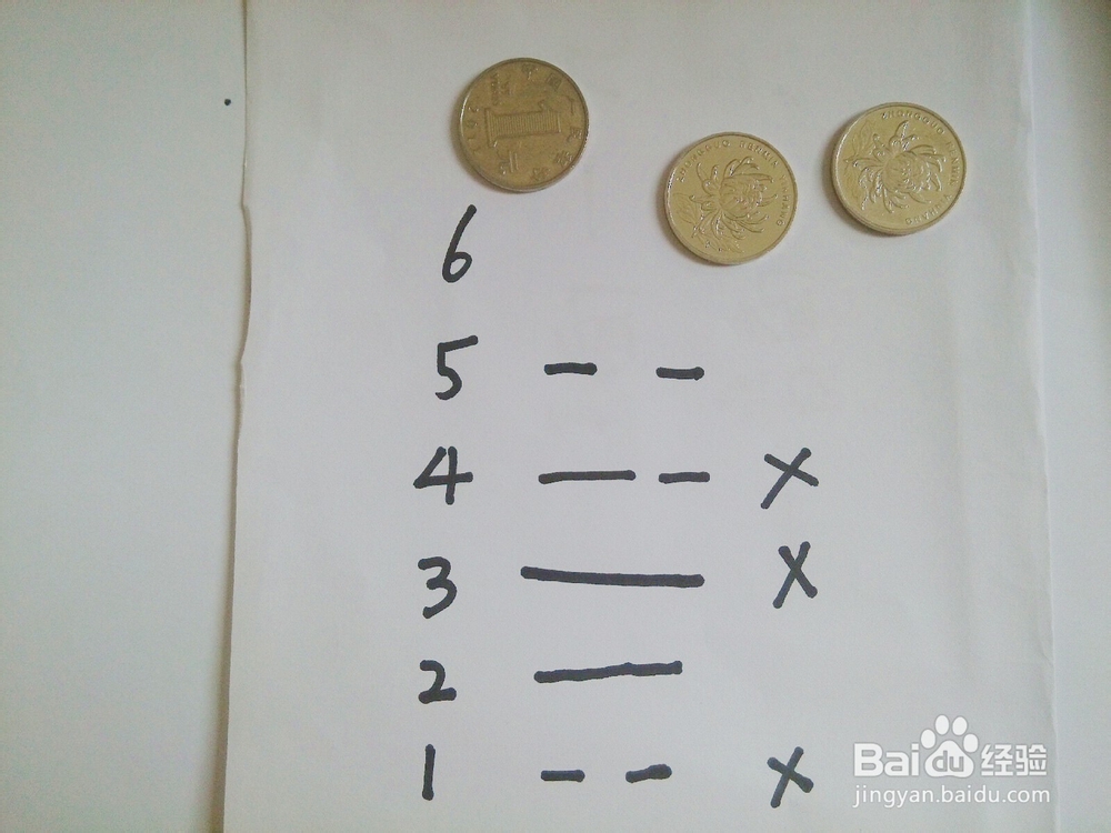 小编的第一卦为老阴爻,也就是变卦。我们在后面打个x做记号。(三反)