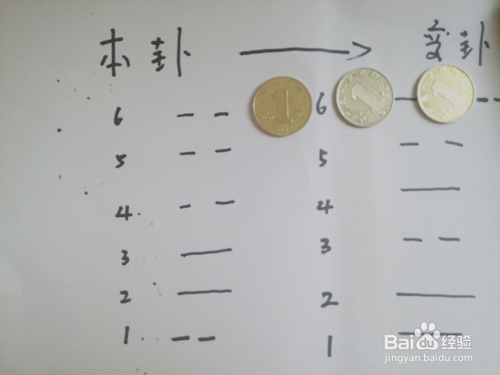 算出来的六爻叫做本卦。然后再写一遍,老阳变阴,老阴变阳。叫做变卦。