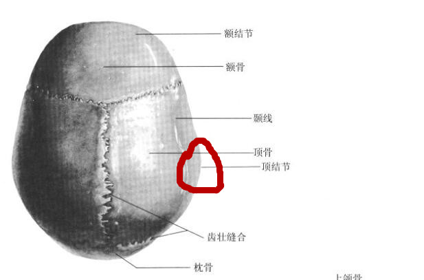 顶结节(parietal tuber)位于顶骨颞线中央,耳尖上方约5厘米,顶骨外面最突出处。