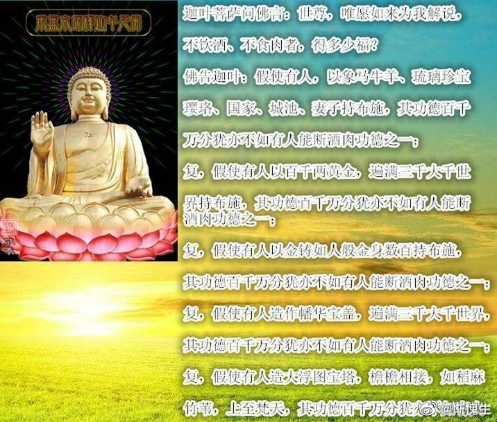 ![]() 每个人吃素的福报都是不一样的,你最需要什么,你吃素所得的福报可能就是什么,比如文中开头提到大S希望吃素可以拯救自己的比格犬,所以她决定吃素。 还有的人身体不好,决定吃素,没想到慢慢的也得到了正回报,高血压、高血脂、高血糖不见了,身材变的苗条了。 当然,学佛不一定吃素,但吃素有利于学佛。释尊住世时,没有规定必须吃素。为什么呢?因为当时古印度,修行人是乞食,换句话说,人家供养你吃什么,你就得吃什么,不能挑剔。挑剔于个人而言是分别心,于众生而言另众生生烦恼,不好的。所以才有所谓的“三净肉”的说法。