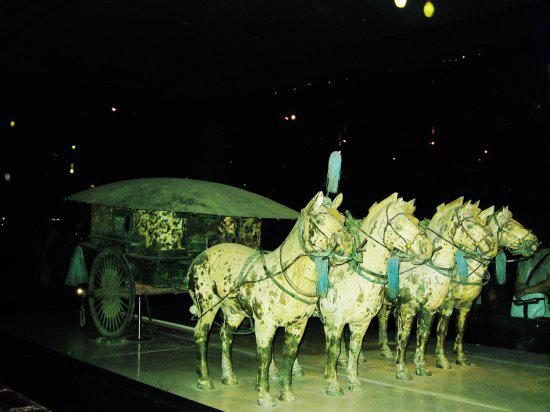 河姆渡遗址的发现无可争辩地证明,7000年前的长江流域已有高度发达的文化,它为中国文明的起源和中华民族多元一体格局的形成做出过巨大的贡献。 兵马俑:秦帝国的赫赫武功 1974年3月,陕西省临潼县农民在打井时偶然发现了高大的武士俑和车马俑。深埋地下的古代大军震动了全世界。秦兵马俑被称为世界第八大奇迹。 在陕西临潼的骊山北麓,有一座中国第一帝陵??秦始皇陵。举世闻名的兵马俑就位于始皇陵园东门大道的北边。1974年3月,临潼县一位普通农民在打机井时意外发现了与真人大小相仿的陶制人头、人身和手。县文化馆有关人员闻讯后赶到现场,进行了初步的收集和清理。 此时回乡探亲的新华社记者蔺安稳听说了此事,便内部报道了这一消息。在国家文物事业管理局和中科院考古所有关专家的视察和批准之后,陕西省组织考古队开始了发掘。 ![]()