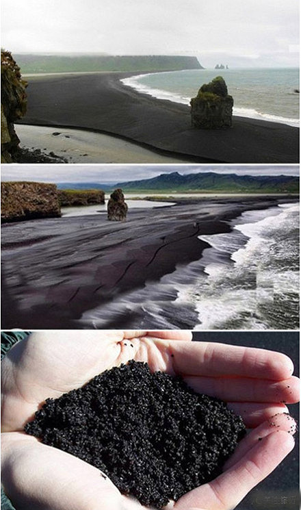 黑沙滩的“沙”其实是颗粒状的火山熔岩。这些熔岩颗纯粹无杂质,捧起一把,满手乌黑,轻轻一抖,黑沙四散,手上却纤毫不染。