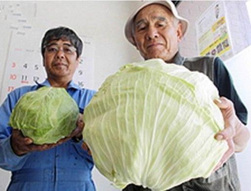 两名园丁一人捧着一个卷心菜,一个大小正常,另一个至少是它的4倍。
