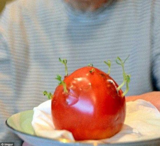 一个发生变异的西红柿,表面钻出嫩芽
