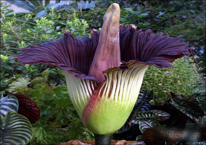 泰坦魔芋花的特点就是它散发出的味道,和一般的花朵不同,它不但没有香味,还臭的惊人,闻起来很像腐烂尸体发出的气味,另外花朵温度大大高于周围温度,可达到38℃。泰坦魔芋是通过应激反应来生成臭味物质的,释放的热量还能把刺鼻的臭味散布到更远的地方。通过模拟刚死去动物的尸臭来吸引“腐食昆虫”来帮助自己传播花粉。