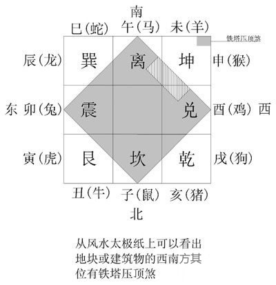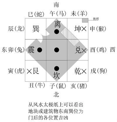 转动中间罗盘,使指南针与海池中的南北重叠。(注:指南针红色所指的方向永远为南方,应与海池中所标的南重叠,不可与北重叠)如图 ![]() 这时只要观察外框四边中间的十字线(方位基准线)就可看出指向何方。如图:因墙面与纵基准线相平行,纵基准线所指向东南巽位,便可知建筑朝向东南。 ![]() 第二步:查看罗盘上的各方位代表,做好标注定好方位后,在风水太极纸(附图可自制)上记录下建筑或地块的形状、方位。 ![]() 太极纸中的灰色代表地块或建筑物 ![]() ②标注好有缺损的方位。 ![]() ③标注好有形煞的方位。 ![]() ④标出开门位置。 ⑤查八方位开门吉凶表。标注地块或建筑物各方位吉凶。 ![]() ![]() 在风水太极纸(或罗盘)上查出门向生肖,再查合、冲、刑、害附表,标出与门向生肖合、冲、刑、害的主人生肖。 蛇 冲:亥(猪) 刑、害:寅(虎) 合:申(猴)、酉(鸡)、丑(牛) 会:午(马)、未(羊) ③至此所有的地块信息汇总在一张图表上,下一步我们就可以根据图表判断吉凶了。 第三步:判断 ① 看方位朝向。 ② 看建筑物或地块缺损凹凸的方位代表。 ③ 看开门方位定八方吉凶。 ④ 看开门生肖对人的影响。 看各方形煞对地块或人事的影响。 案例分析: 1.通过使用和查看罗盘,确定该地块或建筑物朝向东南,八卦位为巽位(巽位代表长女、代表肠、足和不稳定)。但巽位完好无损又无形煞,便知此门一切无妨。 2.地块西南坤位有缺损,查罗盘得知坤位代表母亲、夫人、企业的女主人、老板娘,又代表身体的胃,以及为人处事的软弱状态。 3.通过查看罗盘得知大门开在东南方巽位,查看八方位开门吉凶表得知其中的? 方位比较吉祥,可布置重点部门。如食堂、办公楼、厂房或住宅的房间,厨房等。尽量避免布置厕所、垃圾房等。 方位表示有问题,要慎重布置,不可设置厨房、食堂、办公室等。 4.查罗盘得知开门在巽位但又偏向生肖蛇方。再查生肖合、冲、刑、害表得知,蛇对属猴、鸡、牛、马、羊人比较有利,对属猪人会有各种冲突矛盾,对属虎之人会有伤害。 5.通过查罗盘看出在八卦坤位有缺损并有形煞铁塔冲克,查形煞代表附表得知,铁塔煞会破坏磁场。坤代表母亲又代表胃,说明有可能宅中母亲或企业女领导会有胃病发生,或软弱无能或影响人生轨迹。这个方向生肖有未(羊)和申(猴),(可查生肖、地支转换表)那么属羊和猴的母亲或企业女领导就要更加注意。 生肖合、会、冲、刑、害以及代表 1.生肖二合 子(鼠) 合丑(牛) 寅(虎) 合亥(猪) 卯(兔) 合戌(狗) 辰(龙) 合酉(鸡) 巳(蛇) 合申(猴) 午(马) 合未(羊) 注:相合为好,从罗盘上查门向生肖代表。如门向生肖与人的生肖相合,则吉祥如意。 2.生肖三合 申(猴)、子(鼠)、辰(龙)三合 亥(猪)、卯(兔)、未(羊)三合 寅(虎)、午(马)、戌(狗)三合 巳(蛇)、酉(鸡)、丑(牛)三合 所谓三合,即从罗盘中查出门向方位的生肖代表,与人的生肖和办公楼或家庭厨房或房间方位生肖相合,称三合。三合为大吉之祥。三合:主人神气安定,周旋方便,聪慧疏通。 3.生肖三会 寅(虎)、卯(兔)、辰(龙)三会 巳(蛇)、午(马)、未(羊)三会 申(猴)、酉(鸡)、戌(狗)三会 亥(猪)、子(鼠)、丑(牛)三会 三会指从罗盘中查出门向方位的生肖代表与人的生肖和办公室生肖相会。如:某人属亥(猪),门向朝北的子(鼠)方,办公室方位在东北偏北的丑(牛)位,这就形成了亥、子、丑三会。 4.对冲 子(鼠) 冲午(马) 丑(牛) 冲未(羊) 寅(虎) 冲申(猴) 卯(兔) 冲酉(鸡) 辰(龙) 冲戌(狗) 巳(蛇) 冲亥(猪) “相冲”代表明确的对立矛盾。查罗盘中的门向位置的生肖与人的生肖或办公楼位置生肖,如果相冲,则表示各种矛盾会突出。 5.相害 子(鼠)与 未(羊)相害 丑(牛)与 午(马)相害 寅(虎)与 巳(蛇)相害 卯(兔)与 辰(龙)相害 亥(猪)与 申(猴)相害 酉(鸡)与 戌(狗)相害 “相害“代表暗中有与自己作对的方面。查罗盘中门向位置与人的生肖或办公楼位置生肖,如有相害,则表示暗中有加害的人事。 6.相刑 子(鼠)与 卯(兔)相刑 丑(牛)与 戌(狗)相刑 戌(狗)与 未(羊)相刑 辰(龙) 与辰(龙)相刑 酉(鸡) 与酉(鸡)相刑 午(马) 与午(马)相刑 亥(猪) 与亥(猪)相刑 “相刑”代表苦难、刑罚、伤痛。查罗盘中门向生肖与人的生肖或办公楼生肖,如有相刑,则表示有伤痛、苦难之事。 八方位开门吉凶表 ![]() ![]() ●代表吉位,不可设置垃圾场、厕所、污水处理场等 ×代表有问题,要慎重布置,不可设置池塘、办公室、厨房等 |