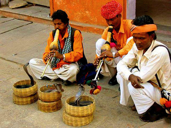 全印度信仰印度教的教徒约占总人口的83%,在虔诚的印度教徒眼中,蛇并非毒物,而是通人性的神。只要人无伤蛇之心,蛇就没有害人之意。外表威猛的眼镜蛇更是财神的化身,只要你善待它,并供它食物,命中一定会走好运。在印度许多农村都有香火缭绕的蛇庙,有些尚未生育的善男信女,为求得一男半女,对庙里供奉的蛇神更是顶礼膜拜。