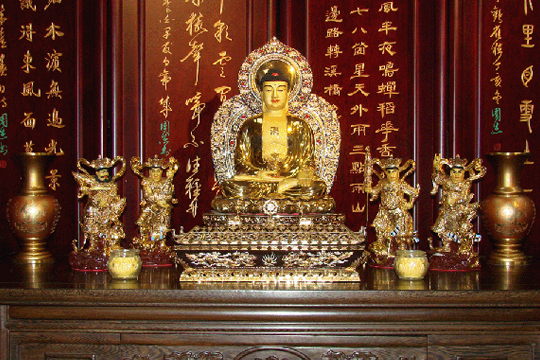释迦牟尼佛像(中),佛右方可安奉“法本”、“经典”;佛左边安奉文殊、观音、普贤、等菩萨,以及舍利塔。佛像供养处宜略高。佛像前可供曼达盘,最外缘供五供、八供品。