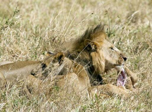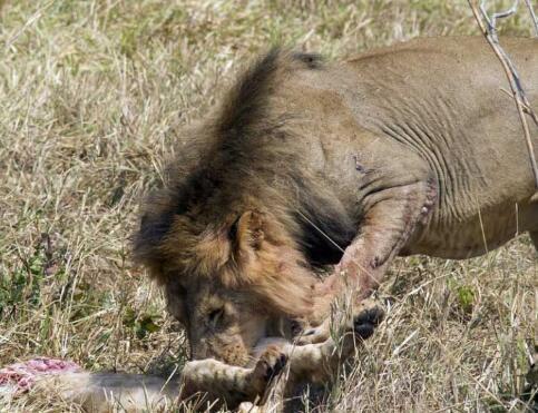 小幼狮的身子已经被雄狮啃食掉了一半,而雄狮却仍然没有停止进食,忽然一只母狮来了。