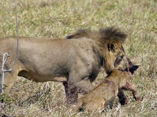 雄狮咬死小幼狮后便叼着尸体开始转移,似乎它想要寻找一处更为隐蔽的地方。