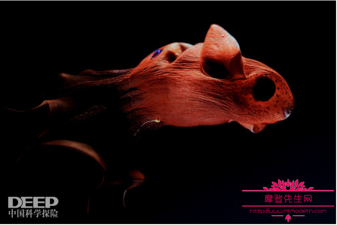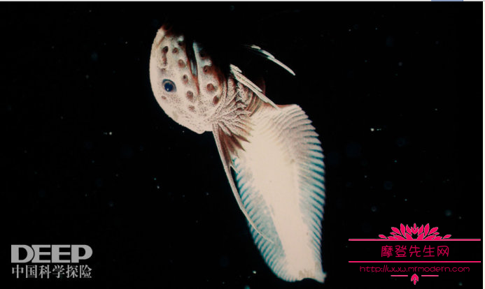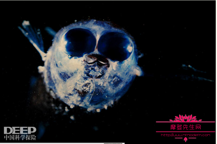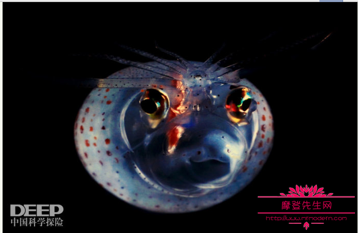 这是一种神秘的深海鱿鱼,一般呈深红色或黑色,可长达40厘米。它一半似章鱼,一半似鱿鱼,在地球上已存在超过2亿年,是躲藏在深海的稀有“活化石”,能存在在地球上这么久全因它具备生活在极低含氧量水域的能力。鱿鱼头顶上的蓝色闪光球体并不是眼睛,而是发出冷光的发光器官。