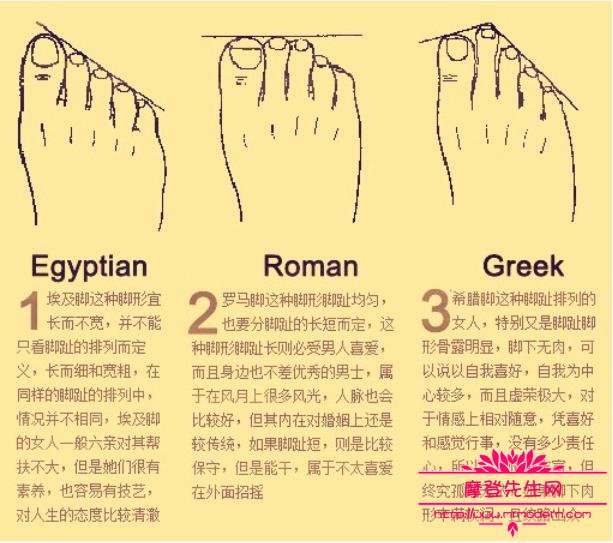 希腊脚为什么专出大美女 希腊脚是指二脚趾长于大脚趾的脚。研究发现,第二个脚趾长的女性不一定是美女,但美女绝大多数都符合第二脚趾长的特征。 尽管还不能科学解释为什么美女一般都是第二脚趾长的,但大量的证据证明了第二脚趾长的女性中美女的比例(40%)远高于大脚趾长的女性中出现美女的比例(5%)。故我们不难得出结论:看一个女人是否漂亮,脚趾是检验的第一步。 实际上,关注身体结构的科学家们早已统计过世界上女性第二脚趾长的人数与大脚趾长的人数比是20%:80%。将前面两个数据进行简单的计算可以得出美女与非美女的比大概就是12%:88%,这也就一定程度上解释了为什么世界上长相一般或长相难看的女人占了大多数。 在对一系列女艺人的调查中发现具有第二脚趾长的特征的有: 大陆:王菲、巩俐、周迅、章子怡、倪虹洁、曾黎、范冰冰、蒋雯丽、李冰冰、孙俪、高圆圆、陈好、陈红、徐帆、蒋勤勤、黄奕、傅艺伟。 台湾:林志玲、徐熙媛、徐熙娣、蔡依林、范晓萱、侯佩岑、徐怀钰、张韶涵、萧淑慎。 香港:刘嘉玲、瞿颖、朱茵、李嘉欣、李若彤、黎姿、应采儿、杨恭如、佘诗曼、郭可盈、蔡少芬、邱淑贞、温碧霞、翁虹、陈慧琳、张柏芝。 日本的:酒井法子,赖户早妃。 韩国自然美女金泰熙。 泰国的Taew。 欧美的明星就不举例了,更多了,尤其是那些美脚的模特大多数都符合第二脚趾长的特征。 当然如果你对欧洲的艺术作品感兴趣,看看断臂的维纳斯,圣母玛利亚的脚。 怎么分辨希腊脚、罗马脚、埃及脚 埃及脚 “埃及脚”脚型最普遍,大拇趾比其他4根脚趾长,中国台湾男性几乎都是这种脚型,而这种脚型比较适合穿斜头鞋。 希腊脚 “希腊脚”则是第2根脚趾比其他还长,适合穿尖头鞋,通常拥有这种脚型的人四肢修长。 罗马脚 “罗马脚”也称为正方形,这种脚型5根脚趾长度都差不多,没有特别凸出的脚趾,看起来就像正方形一样,“罗马脚”在选鞋时,可以挑选圆头、方头鞋,而拥有“罗马脚”的人较罕见,他们特别适合跳芭蕾舞。 |
