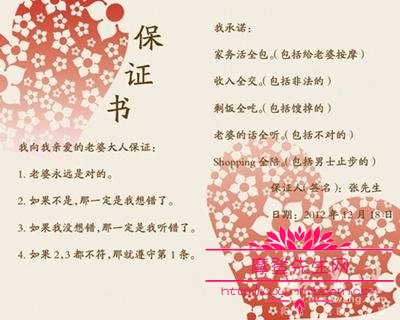 读书时保证书没少在我们的学习生涯中出现,没有写作业、上课讲小话、吃零食、开小差只要被老师抓到必定逃不了写保证书的下场,老师要求我们写保证书必须做出十分深刻的检查和反省。“保证书,保证书,保证以后不读书。”我们高唱着这个小调,怀着极不情愿的愧疚和懊悔汇总着上下五百年承认错误的词语来凑字数,这是多么深刻的回忆啊。现在两夫妻吵架老婆有时也要老公写保证书,老公写给老婆的保证书应该是什么样子呢?