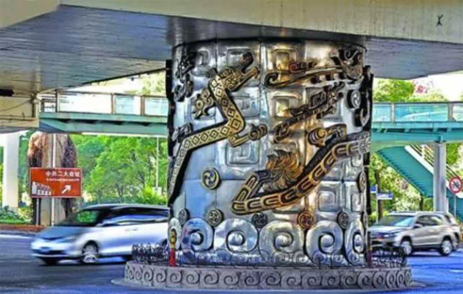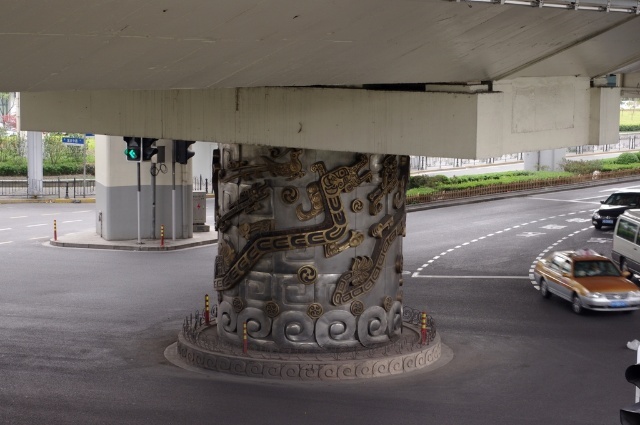 现在唯一能看到的痕迹,就是在接口处地桩上浇筑的巨大的七根圆型支柱周身,围上了白钢形成一个大柱,并装上了龙型纹饰,实际是九条张牙舞爪的龙形,当地人称〝龙柱〞,有人说是作为对佑助打桩成功的神明灵物的祈敬,也有说是因为要包上龙,才能确保柱子不会倒一下,大和尚作法的布置,只传数个领导和工程负责人,并再三吩咐密而不宣,所以外人无从获知详情。这个故事在上海流传很久,曾有该工程某技术负责人在报上辟谣说,全无此事,龙型的纹饰纯为市容美观而装置的。但谁也不信这位工程技术负责人的说明,原因若纯粹是为了美化市容,上海高架路有不下成百上千个支柱,无一例外都显露着水泥混凝土的本色,唯有南北和东西高架路相接处下一柱妆以龙纹,并且是银底金纹的龙纹。这也是上海政府不得不留下的风水灵异铁证。