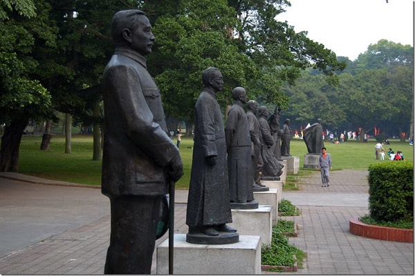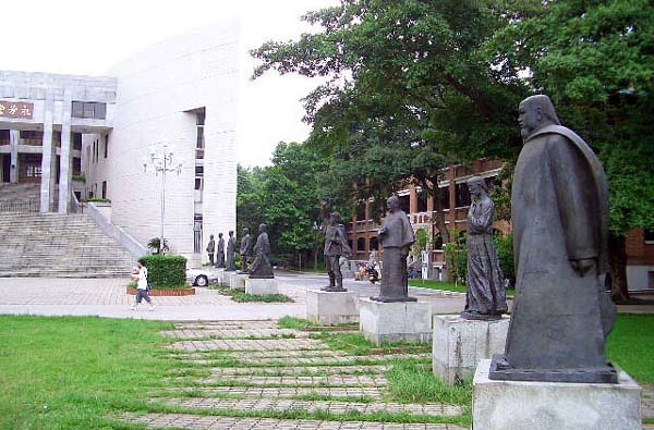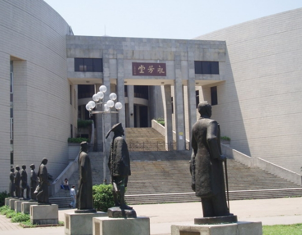 永芳堂与其说是一座楼,不如说是一座彻头彻尾的垃圾。它正面的墙体并不是平的,而是由三个弧面组成。这三个弧面是向外拱的,好像要把迎面走来的人拱回去一样。中国传统的建筑学讲一个“敛气”,就是模仿自然界山环水抱的形态,将气机收拢住,平和稳定地流转,如此才适合居住。像永芳堂这样,不讲内敛,反将气机外放形成冲煞格局的,只有军事建筑。更荒唐的是,永芳堂前面竟然摆放了十八个近代先贤的铜像,分列两旁——这在中国建筑学中更是大忌,因为只有陵墓前摆放的石人石马才呈如此格局。
