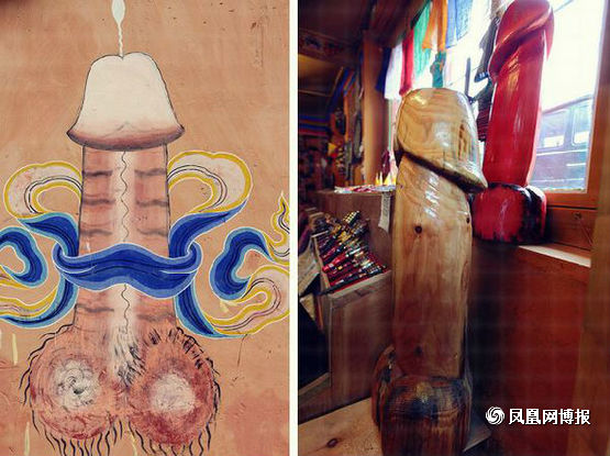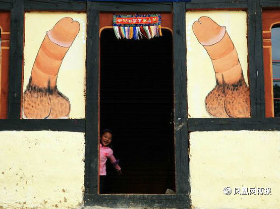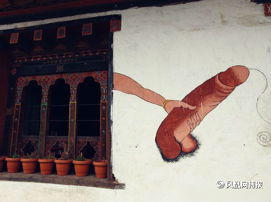 在不丹,尤其是乡村里,几乎家家户户外墙上都画有男性生殖器的图案,有的大门正中上方挂着生殖器的木雕,或把生殖器造型雕在房屋顶部的四个角上,更有把生殖器木雕与佛像摆在一起供奉的,传说能给房内的住户带来好运。不丹人对男性生殖器的崇拜与性完全无关,只是一种吉祥物和装饰,所以才如此张扬毫不含蓄和掩饰。 ![]()