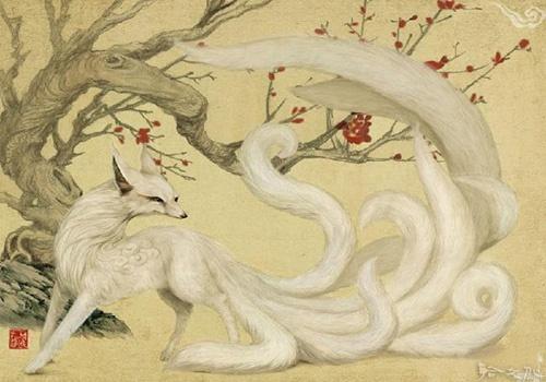 《海外东经》:“青丘国在其北,其狐四足九尾。” 《大荒东经》:“有青丘之国,有狐,九尾。”史书中记载,九尾狐成就了“大禹”与“涂山氏”的佳缘,成为了中国古书中出现的最早的“婚姻中介”,传说中人吃了她的肉,可以不逢妖邪之气,抗拒蛊毒。九尾狐在《山海经》中出现了三次,后来成为祥瑞和子孙繁荣的象征。