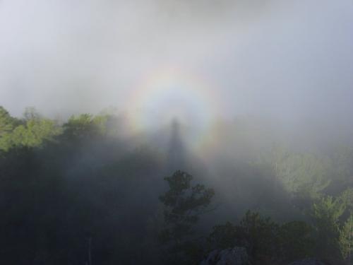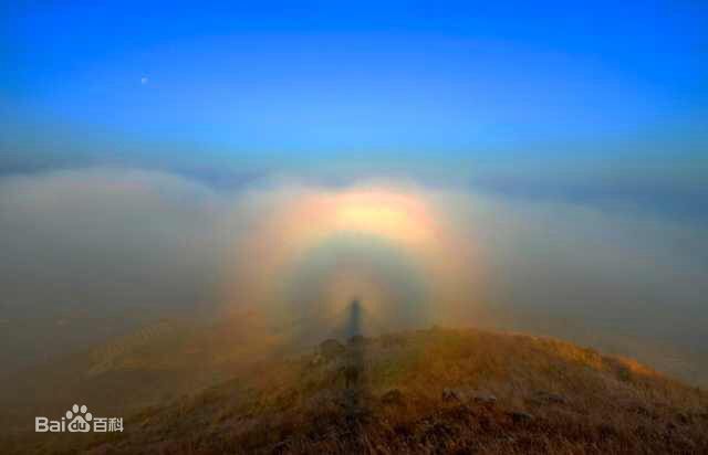 “佛光”出现时间的长短,取决于阳光是否被云雾遮盖和云雾是否稳定,如果出现浮云蔽日或云雾流走,“佛光”即会消失.一般“佛光”出现的时间为半小时至一小时.而云雾的流动,促使佛光改变位置;阳光的强弱,使“佛光”时有时无.“佛光”彩环的大小则同水滴雾珠的大小有关:水滴越小,环越大;反之,环越小. |