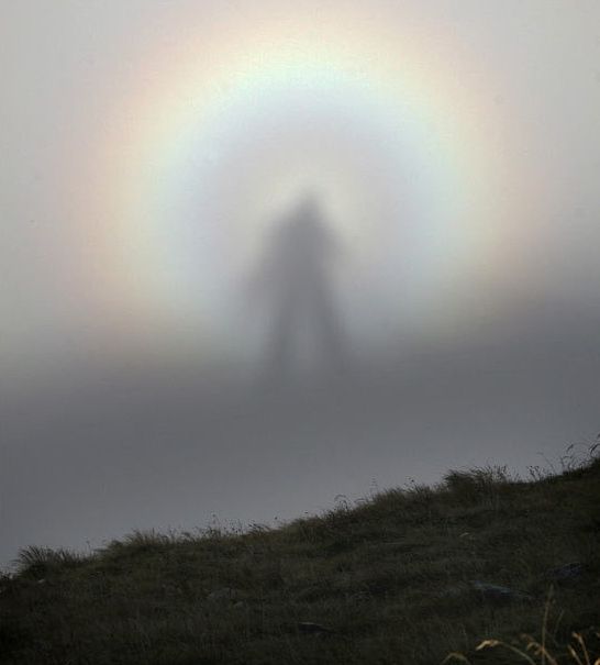 “佛光”发生在白天,产生的条件是太阳光、云雾和特殊的地形.早晨太阳从东方升起,佛光在西边出现,上午“佛光”均在西方;下午,太阳移到西边,佛光则出现在东边;中午,太阳垂直照射,则没有佛光.只有当太阳、人体与云雾处在一条倾斜的直线上时,才能产生佛光.它是太阳光与云雾中的水滴经过衍射作用而产生的.如果观看处是一个孤立的制高点,那么在相同的条件下,佛光出现的次数要多些. “佛光”由外到里,按红、橙、黄、绿、青、蓝、紫的次序排列,直径约2米左右.有时阳光强烈,云雾浓且弥漫较宽时,则会在小佛光外面形成一个同心大半圆佛光,直径达20-80米,虽然色彩不明显,但光环却分外显现.”“佛光”中的人影,是太阳光照射人体在云层上的投影.观看“佛光”的人举手、挥手,人影也会举手、挥手,此即“云成五彩奇光,人人影在中藏”,神奇而瑰丽.