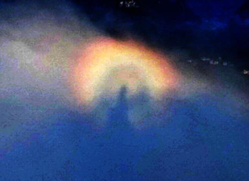 ![]() 为什么照相会出现佛光? 佛光是一种非常特殊的自然物理现象,其本质是太阳自观赏者的身后,将人影投射到观赏者面前的云彩之上,云彩中的细小冰晶与水滴形成独特的圆圈形彩虹,人影正在其中.佛光的出现无原则要阳光、地形和云海等众多自然因素的结合,只有在极少数具备了以上条件的地方才可欣赏到.