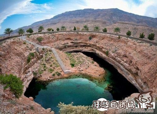 6. Bimmah天坑(阿曼,马斯喀特) 坐落在阿曼首都的一个公园。美丽的绿色水域深约65英尺(20 米),宽约131英尺(40米)。水底隧道连接着深洞与海洋,这也许是它的湛蓝色调令人着迷的原因吧。Bimmah天坑已经成为一个倍受青睐的旅游胜地。 游客们十分享受浸泡在水中观赏鱼跃的那份惬意,还有些人干脆跳入池中,激起水花四溅。尽管天坑是因石灰岩侵蚀与沉陷形成,然而当地神话传说却十分奇特-- 它是流星陨落而成的。 ![]()