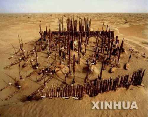一座巨大而奇异的圆形沙丘进入了考古队的视线。沙丘足有半个足球场大,顶部密密地插着200多根棱形、圆形木柱。
