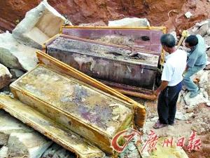 张祥稳赶紧打电话,租来了一台工程用挖掘机。挖掘机用挖头连续击打了“石椁”几十次,终于破开了像石头一般坚硬的三合土。他发现,里面有两副红色漆面的木椁,散发出金丝楠木的香味。