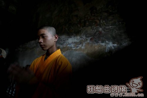 王孟博从小父亲去世,母亲带着姐姐离家下落不明,之后被少林寺的慈幼院收养。今年15岁的他在释永信师父的安排下来到资寿寺参学。他告诉记者:“以后想考佛学院,做一个普度众生的僧人。”图为王孟博在大殿诵经。