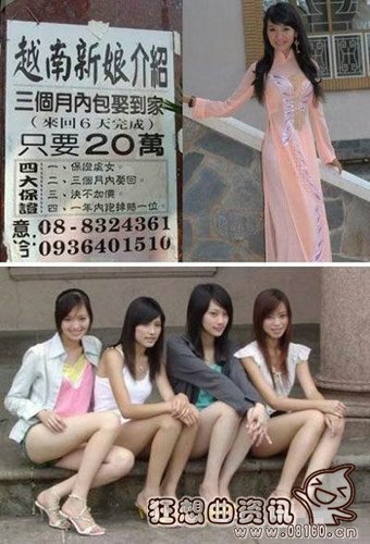国内有些地方“讨媳妇难”,有人就把目光转向了购买“越南新娘”。2011年以来,“越南新娘”购买价从平均每人4.26万元飙升至7.6万元,中间人也可获得1万元“介绍费”。