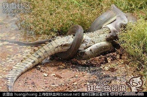 所以这里就要讲明两者是谁先发起攻击的了,如果是鳄鱼首先对巨蟒发起进攻,估计两者平手,但鳄鱼胜算大些。如果是巨蟒首先发起进攻,那么,鳄鱼必定成为巨蟒的腹中食