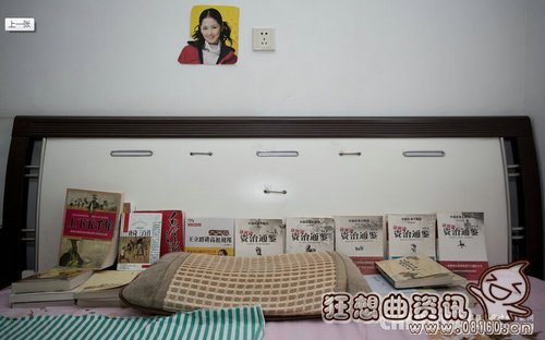 在他的床头,书整齐的码成一排,“我比较喜欢看书”。