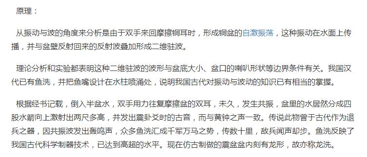 龙洗盆原理是什么 据说龙洗盆的原理是和振动与传导等物理原理有关的,主要的是共振学原理。 只要手在盆上的两只把手上摩擦,就会泛起水花。 对于这个原理,网络上也有一个比较详细的说法: 不得不说,共振的原理在古代的时候其实还并不是能太让人明白的,但是前人却有大智慧,能研究出这些东西,着实让许多朋友感到要赞叹一番。 一个龙洗盆价值多少钱 关于龙洗盆的价值,网络上有几种说法。 都说“龙洗盆”是我们著名文物之一,是现在工艺的一种仿品,但一般仿品便宜的也许只要几十块,但是比较好一点的仿品就要上几百,像到了比较精致的那种地步的话,一个也要几千块。 至于真品那只能说是有价无市,除了一部分被一些收藏家收藏之外,多数的还是在一些地方的博物馆里有存放。 现在我们能够比较常见龙洗盆的地方多数为一些旅游景点,在古代龙洗盆还有被称为“聚宝盆”、“金盆洗手”等,之所以叫龙洗盆是因为盆里有龙纹的纹路。 最有趣的就是龙洗盆起先被传到国外去的时候,许多友人朋友都对龙洗盆的产生出来效果感到惊讶,有种发现新大陆、不可思议的感觉,等他们发现龙洗盆原理就是共振学原理时,是否会感慨中国人民大胆的智慧呢? |